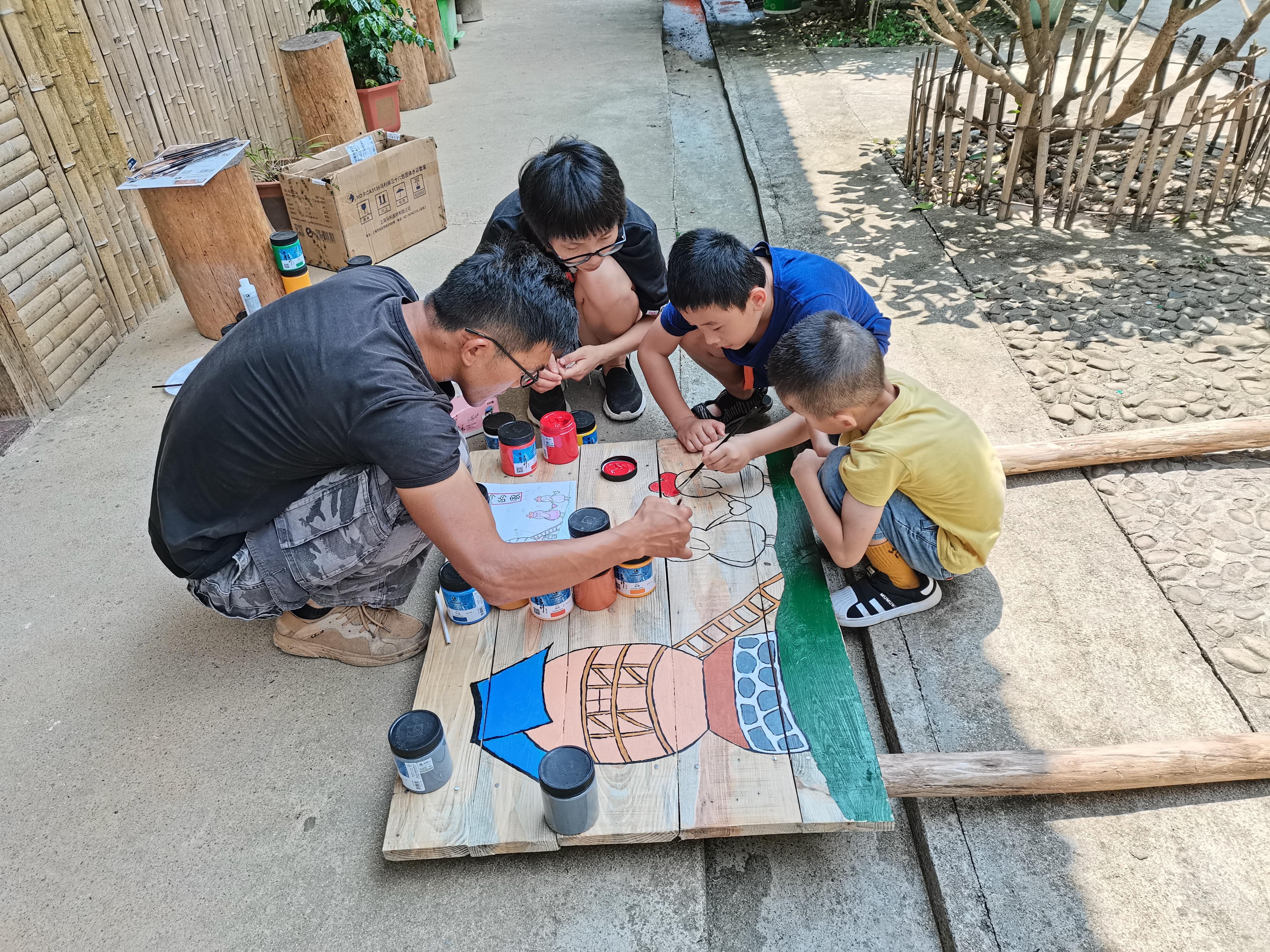 蘇勇釘帶領孩子們制作基地卡通區(qū)域標識牌