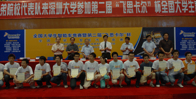 第二屆“飛思卡爾”杯全國大學生智能汽車大賽華南賽區(qū)比賽20日在深圳大學圓滿閉幕。深圳大學、武漢大學、武漢科技大學和華南理工大學等共16支隊伍在華南賽區(qū)25所大學的53支參賽隊伍中脫穎而出,榮獲一等獎。我校的兩支參賽隊伍“追知隊”和“求是隊”以優(yōu)異的成績成功晉級,將代表深圳大學參加8月25-27日在上海交通大學舉辦的全國總決賽。