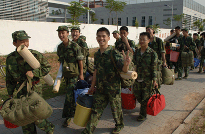 今年我校6000多名本科新生將分赴廣州國防園、廣州武警指揮學院、梅林防化團進行為期15天的軍訓。13日上午,新生們在領隊的帶領下,身著迷彩整裝待發。他們面帶微笑,英姿煥發,對未來半個月軍訓生活充滿信心和期待。上午9:30分左右,車隊從學校南門出發,數百輛50座巴士在寬闊的白石路上擺起長龍,浩浩蕩蕩開往軍訓基地。為保障學生們的安全健康和正常訓練,同去的還有校醫院醫生。而且,每支隊伍都安排了特定的輔導員,照顧同學們的生活起居。