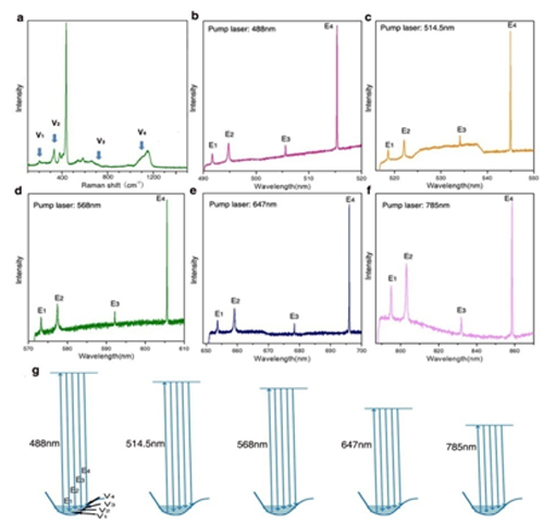 圖2(a)ZnO的拉曼譜;(b-f)ZnO-石墨烯超晶格在不同泵浦光激發(fā)下的激光光譜,對應(yīng)泵浦光波長分別為b)488nm,c)514.5nm,d)568nm,e)647nm,f)785nm,泵浦功率為3.2kW /cm2; (g) 拉曼散射過程的能級圖,其中拉曼振動模V1-V4對應(yīng)圖(a)中的V1-V4,能級圖中的四個(gè)散射光E1-E4對應(yīng)拉曼激光中的E1-E4。