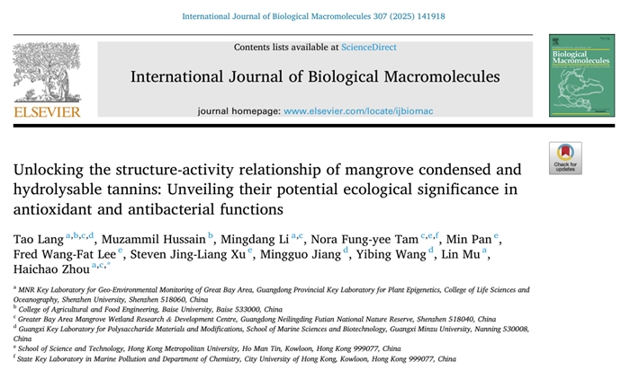 2025年3月,深圳大學生命與海洋科學學院周海超副教授研究團隊在生物學TOP期刊International Journal of Biological Macromolecules上在線發表題為“Unlocking the structure-activity relationship of mangrove condensed and hydrolysable tannins: Unveiling their potential ecological significance in antioxidant and antibacterial functions”的研究論文。該研究系統解析了紅樹植物縮合單寧與水解單寧的結構-活性關系,揭示了這兩類天然多酚化合物在抗氧化與抗菌功能中的關鍵作用,為紅樹林生態功能保護與天然產物開發提供了潛在的新視角。