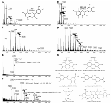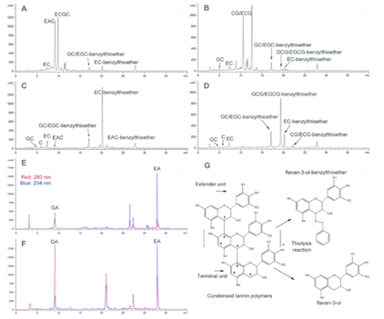 本研究探究了不同紅樹植物單寧的結構及其抗氧化活性關系,并進一步分析不同單寧對紅樹林沉積物微生物的影響作用。該研究以中國常見的三種紅樹林植物:秋茄(Kandelia obovata)、桐花樹(Aegiceras corniculatum)和無瓣海桑(Sonneratia apetala)作為研究對象,利用基質輔助激光解析電離飛行時間質譜(MALDI-TOF MS)以及高效液相色譜電噴霧電離質譜(HPLC-ESI-MS)等技術,對葉片中的單寧結構進行了深入分析。研究發現,秋茄和桐花樹富含縮合單寧(CT),其主要結構單元分別為原花青素(PC)和原兒茶素(PD),而無瓣海桑則以水解單寧(HT)為主的復雜單寧,水解單寧其主要結構單元為沒食子酸(GA)和棓酸(EA)。