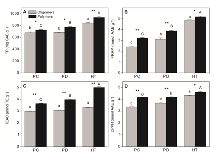 抗氧化活性測試中,研究采用了Folin-Ciocalteu、FRAP、TEAC和DPPH四種方法,結果顯示HT的抗氧化能力最強,其次是PD和PC,且聚合體的抗氧化活性普遍高于寡聚體(圖2)。這主要歸因于結構中對苯二酚和兒茶酚型羥基的數量和位置,HT因富含GA而具有更多的羥基,從而表現出更強的抗氧化活性(圖1)。