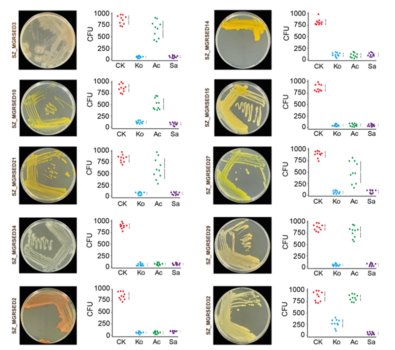 抗菌活性測試則針對從紅樹林沉積物中分離出的10株細菌,包括放線菌門、變形菌門和擬桿菌門的多個屬。結果表明,無瓣海桑的HT對所有測試菌株均表現出強烈的抑制作用,而秋茄樹的CT抗菌效果與HT相當,且顯著強于桐花樹的CT,其中桐花樹的CT對不同菌株的抑制效果差異顯著(圖3)。