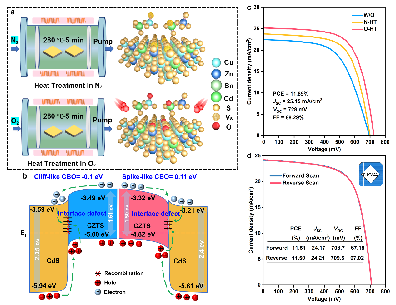 1.針對銅鋅錫硫薄膜太陽電池中的硫空位缺陷問題,創新性地提出可控氧氣氛異質結熱處理策略,發現氧可占據硫空位位點,實現深能級硫空位缺陷的有效鈍化;