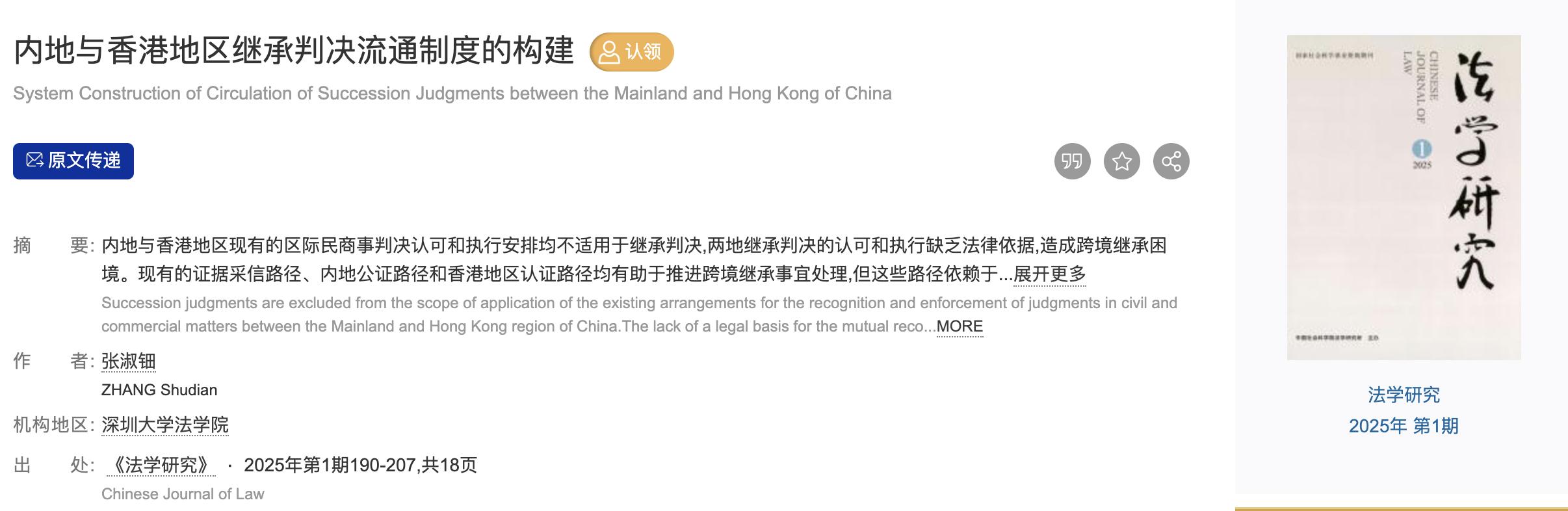 法學院教授張淑鈿在《法學研究》2025年第1期發表論文“內地與香港繼承判決流通制度的構建”